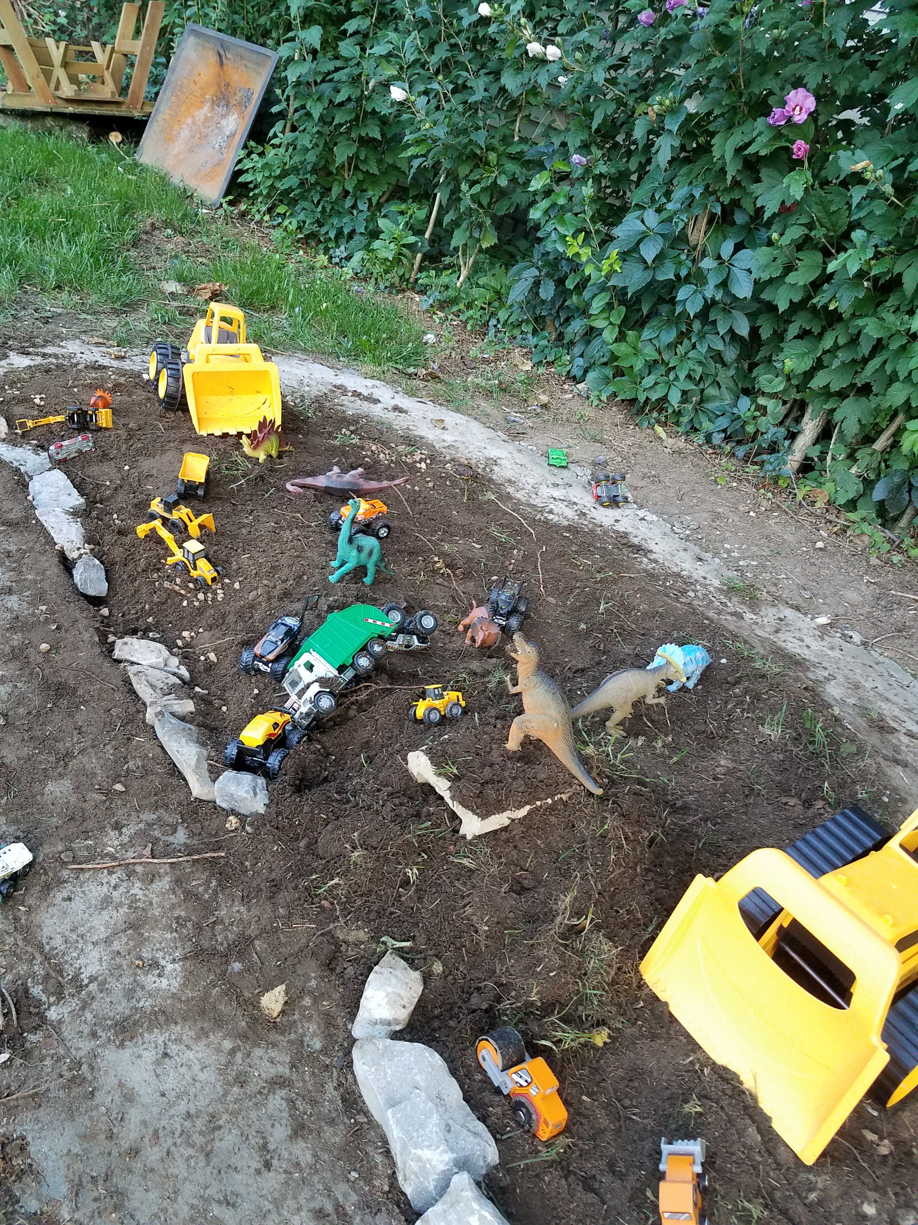 September 9, 2017 at 3024 × 4032 in Backyard Race Car Track & …Dinosaur Garden? 🚚🦕