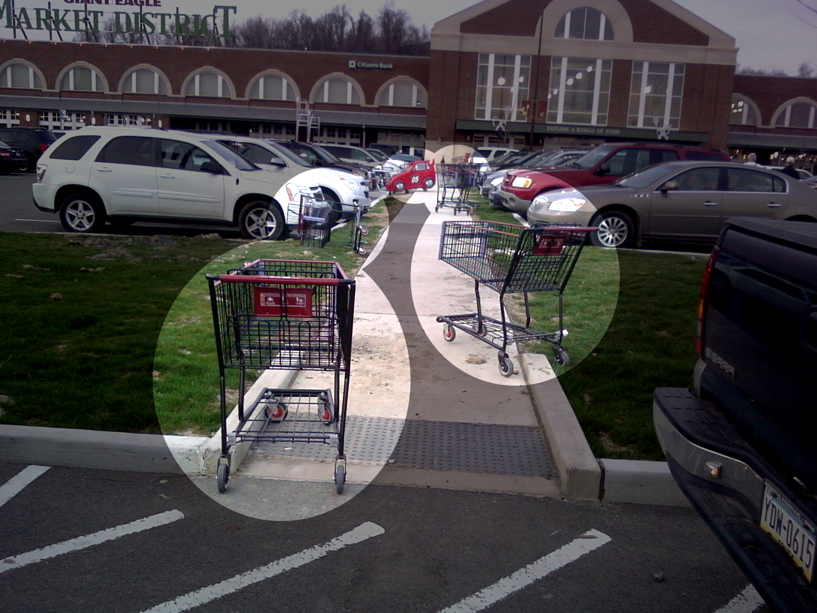 On the outside of the store… the crosswalks are clearly marked (although wholly ignored by the Yinzers), there are nice sidewalks in between rows of the parked cars so you don’t have to walk down the driving lane (but people do anyway), and there are many many places to return your shopping carts.  This is the one that prompted me to write.  I took the following photo with my cell phone…