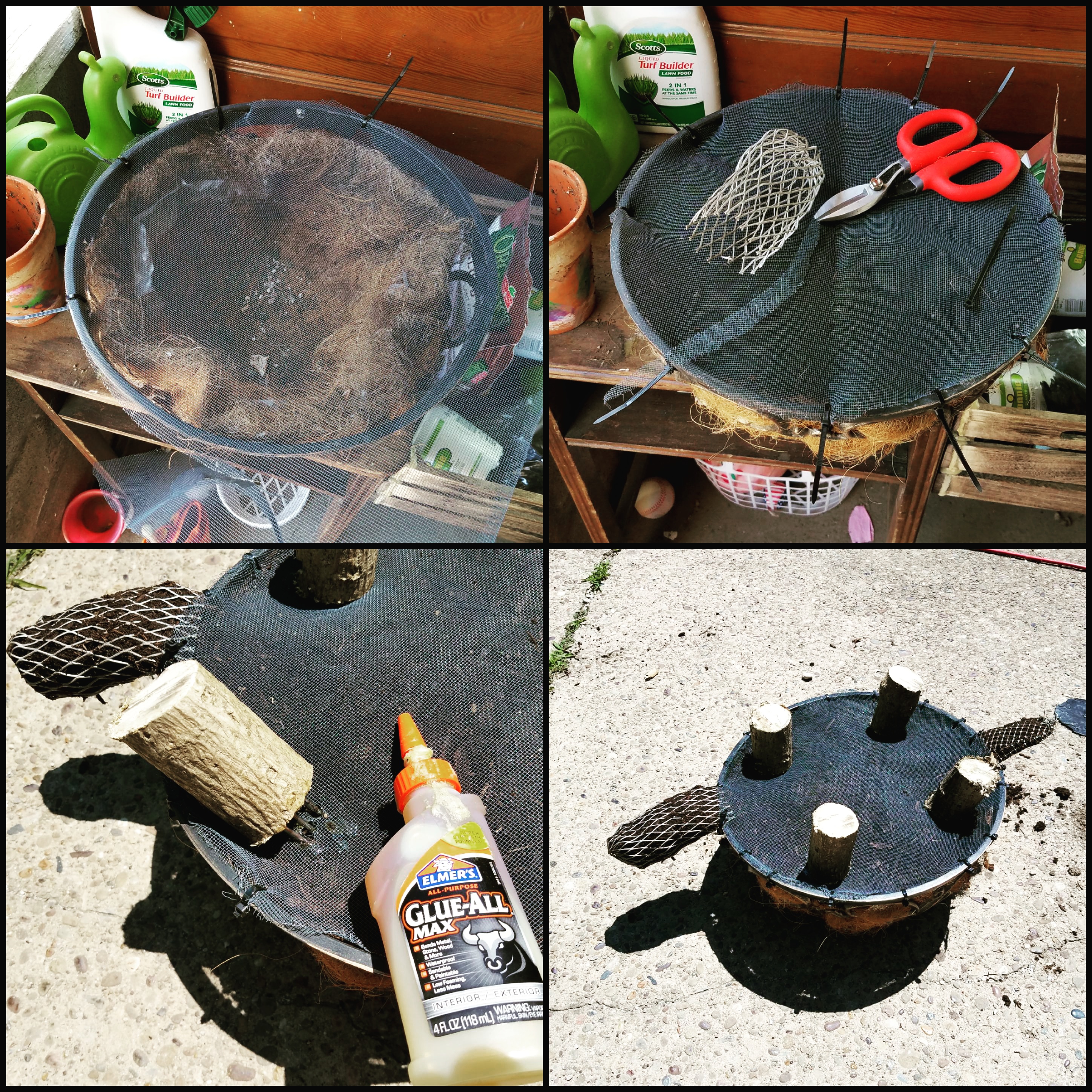 I used what we had around. I just bought a bit of potting & garden soil which I already needed for the vegetable garden. I used an old hanging basket, door screen, two different types of wire mesh that I had in the back yard, and some zip-ties. I had planned on using chicken-wire, but the other stuff seemed better suited to the task.