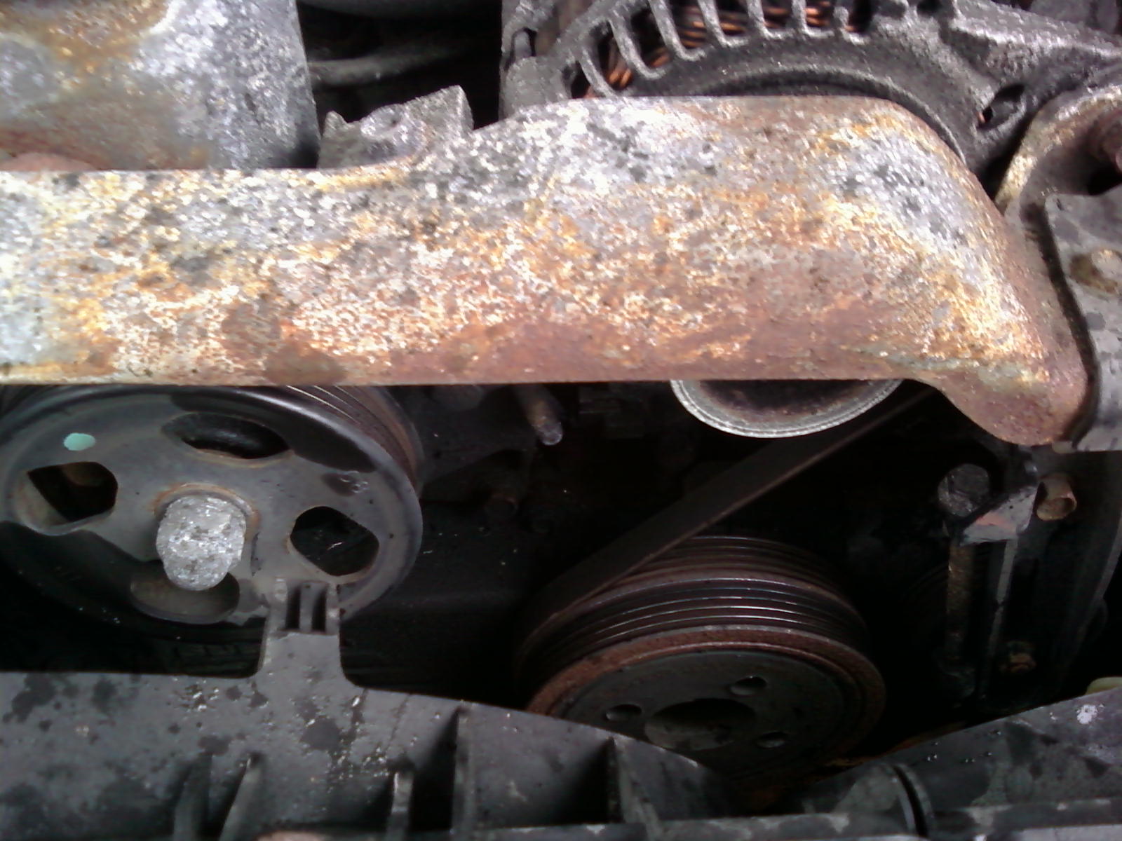 The new longer belt went on with little effort, and then… wouldn’t pull taught even when the alternator was lifted the while way up. My patience was being tested today. I called Advanced Auto… and asked… if there was a size in between the two sizes I had. I was told that there was, but that I probably didn’t want it. The guy told me to un-bolt the pulley from the power steering, and move it to make the smaller belt fit. I could tell that even if I got the smaller belt to fit, there wouldn’t be enough slack to lift the alternator off of the close by A/C belt. (I learned some new terms today.)