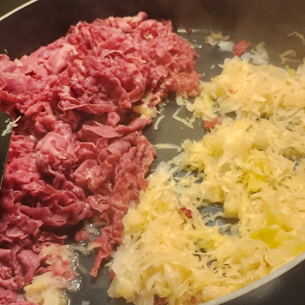 I have had it in my head for a while now that I wanted some of the homestyle creamy baked mac n’ cheese. Inspiration hit with the snow coming down today, wanting some comfort food, so I just did it. I had been wondering if you could use a box of Kraft as the start to “good” mac & cheese, too. I had some stuff in the ‘fridge & pantry to make it happen. Posting it here to remember what I did.