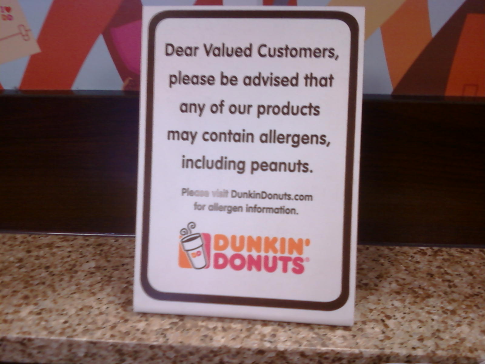 I was in the Dunkin’ Donuts in Dormont this weekend, and I was pleasantly surprised to see this allergen warning sign:  http://i127.photobucket.com/albums/p139/worldandlunardomination/Signs/p_00527.jpg