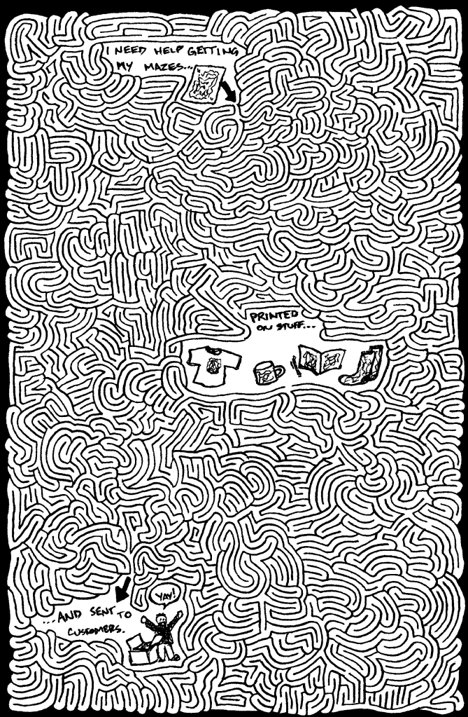 I’m a huge fan of the no-money-up-front model, where you have a shop and a site and I have a small home there.  In that theme I would be using paint.NET or GIMP to tweak the hand-drawn mazes… although I just learned via Twitter that Scribus may be another invaluable free tool for putting together a book.  Do any of you offer printed mugs with dry erase markers?  Also…  I have a legacy pile of mazes some of which are stupidly sized larger than my scanner.  Do you think phone scans would be acceptable if they can provide good enough black & white image quality?